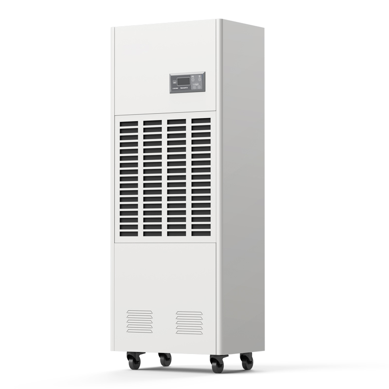 工业用除湿机通过风机将潮湿空气抽入机器内部,通过压缩机制冷将蒸发器降温至露点以下,潮湿空气经过蒸发器在表面凝结成水,汇集至接水盘后,流入水箱中,干爽空气经冷凝器重新加热由出风口排出,这样不断循环将室内湿度降低