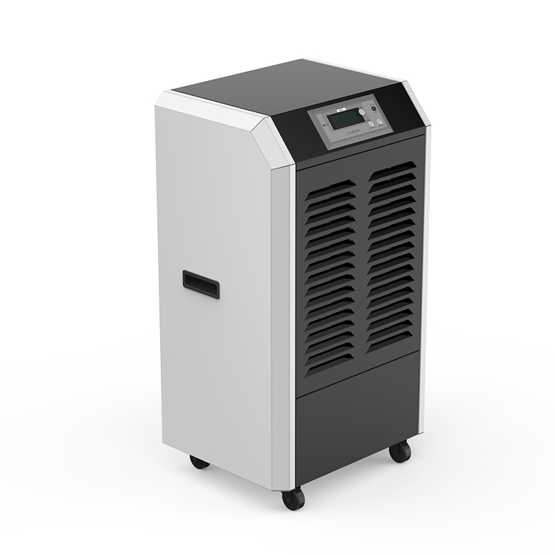 工业用除湿机通过风机将潮湿空气抽入机器内部,通过压缩机制冷将蒸发器降温至露点以下,潮湿空气经过蒸发器在表面凝结成水,汇集至接水盘后,流入水箱中,干爽空气经冷凝器重新加热由出风口排出,这样不断循环将室内湿度降低
